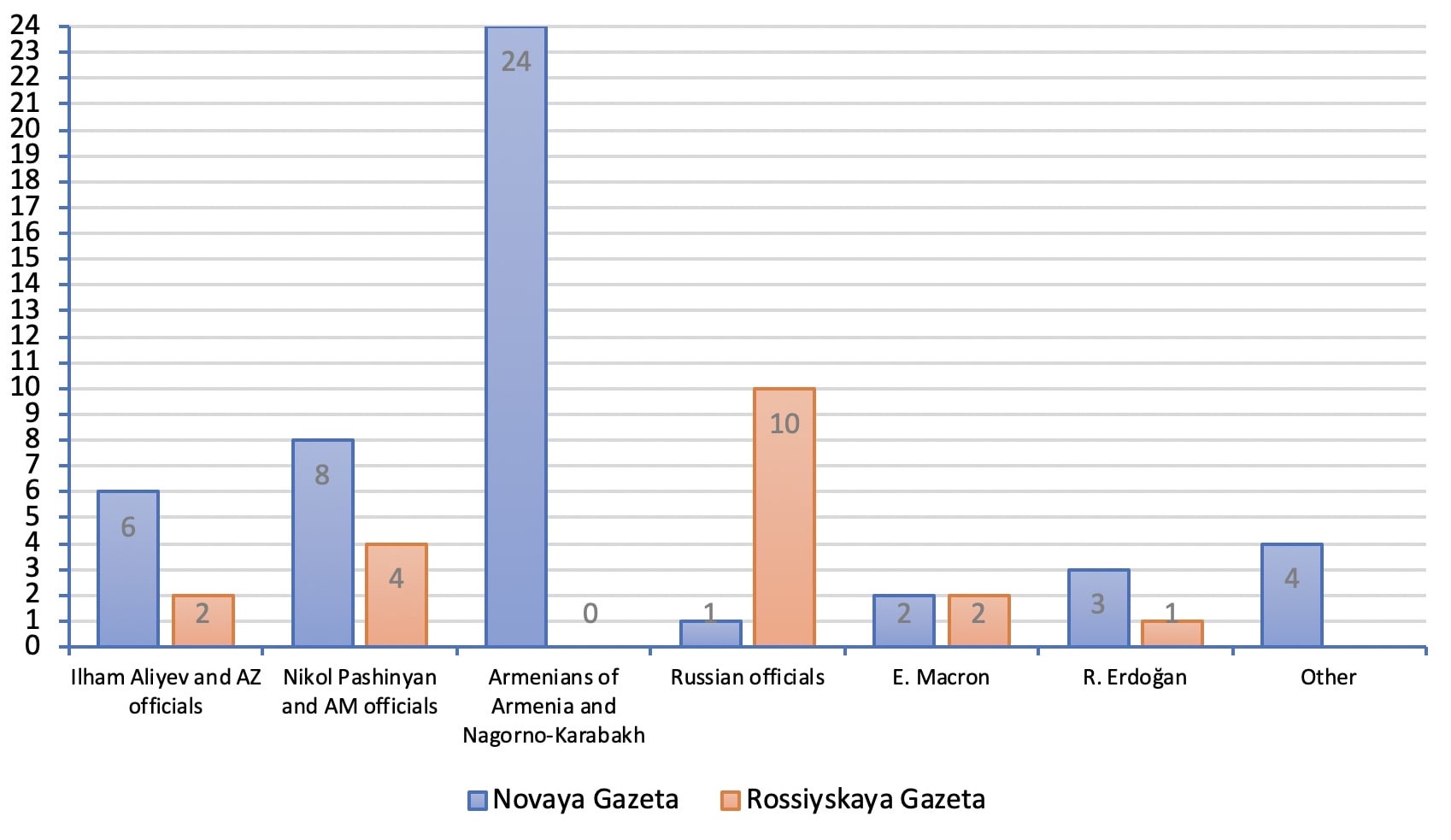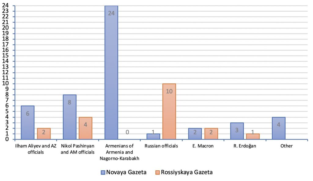 For instance, the percentage of the “The role of Russia” attribute in Novaya Gazeta was 4.5%, while in Rossiyskaya Gazeta, it was 23%. The government publication focused mainly on the calls to put an end to the war by representatives of the legislative bodies of Russia, on the war-related statements of the top political leadership of Russia, on the negotiation process initiated by the Russian Federation[3]. Rossiyskaya Gazeta relaying the Kremlin’s policy can be explained by the fact that the political process related to the Armenian-Azerbaijani war was interpreted by the political elite. In this context, the main aspects of the agenda were set by the authorities, and Rossiyskaya Gazeta played the role of a communication platform helping to convey this agenda to the audience. Novaya Gazeta offered an independent version of coverage based on criticism of Russia’s position[4].