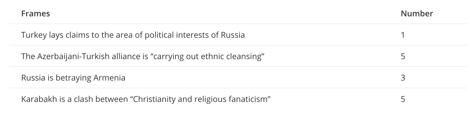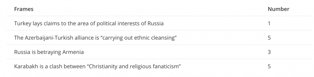 For instance, an article describing the role of Turkey in the Armenian-Azerbaijani war introduces a frame in the form of a metaphorical generalization that carries a negative assessment: “Today Erdoğan’s Turkey, which has quickly turned from an outpost of European democracy in the Middle East into the strongest nationalist dictatorship with a focus on restoration of both Ottoman greatness and pan-Turkic ambitions, lends a helping hand to Azerbaijan.”[10]
