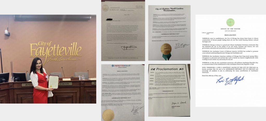 It was noted that the Azerbaijani Center for the Midwest America (ACMA) and the Azerbaijani community in North Carolina are working to promote intercultural understanding between Chicago, Durham, Fayetteville, Apex, Charlotte and Azerbaijan, for a better city and society. “Therefore, on the occasion of the next anniversary of the establishment of the Azerbaijan Democratic Republic in 1918, I declare May 28, 2021 the Day of the Republic of Azerbaijan,” he said.