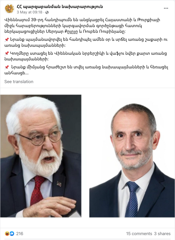 The outcome prompted a flurry of mockery on social media, with photos of Turkish negotiator Serdar Kilic, 64, and his Armenian counterpart Ruben Rubinyan, 32, as they would look in their “39th meeting.”