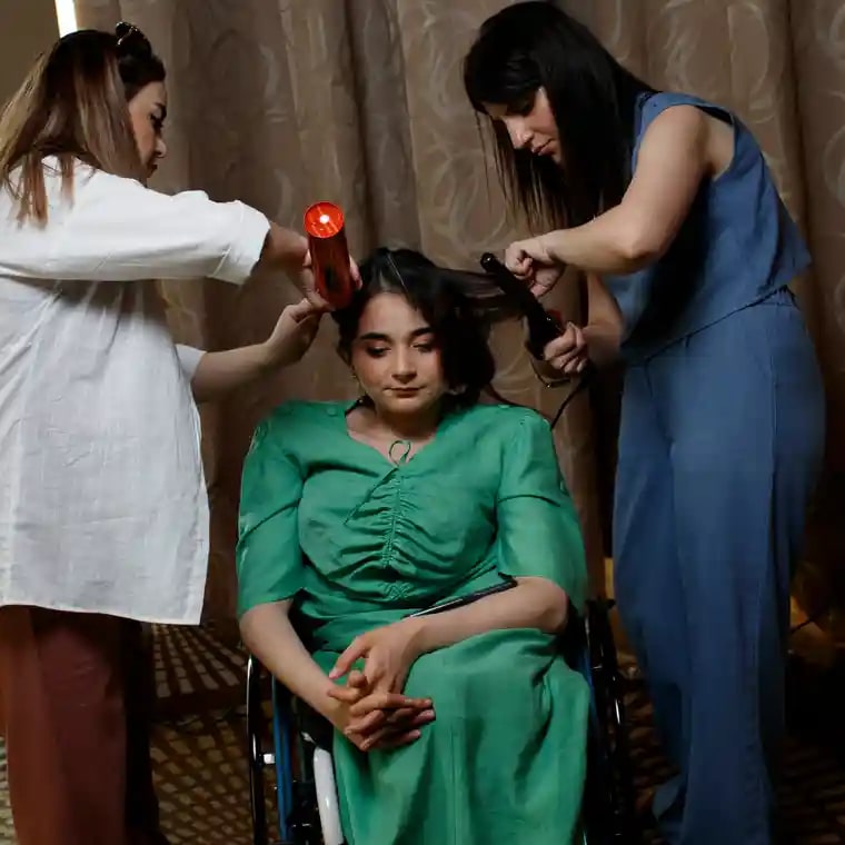 The show was the idea of Mahammad Kekalov, a 21-year-old student. Months before, he had visited Veliyeva and her husband, Galib Aliyev, at their home with his business partner Rashada Aliyeva, the first adaptive clothes designer in Azerbaijan. Aliyev also has a disability, having lost a leg when he stepped on a land mine during the first of two wars between Azerbaijan and neighbouring Armenia in the past 30 years. The conflicts resulted in hundreds of amputees.
