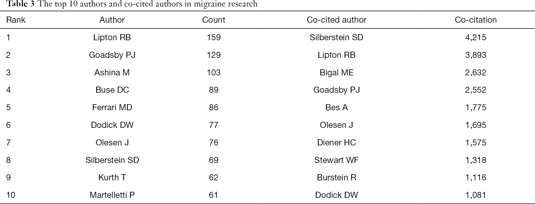 A total of 19,370 authors participated in migraine research. Table 3 presents the top 10 productive authors. Lipton RB published the most papers (n=159, 2.50%), followed by Goadsby PJ (n=129, 2.03%), Messoud Ashina (n=103, 1.62%), Buse DC (n = 89, 1.40%), and Ferrari MD (n=86, 1.35%).