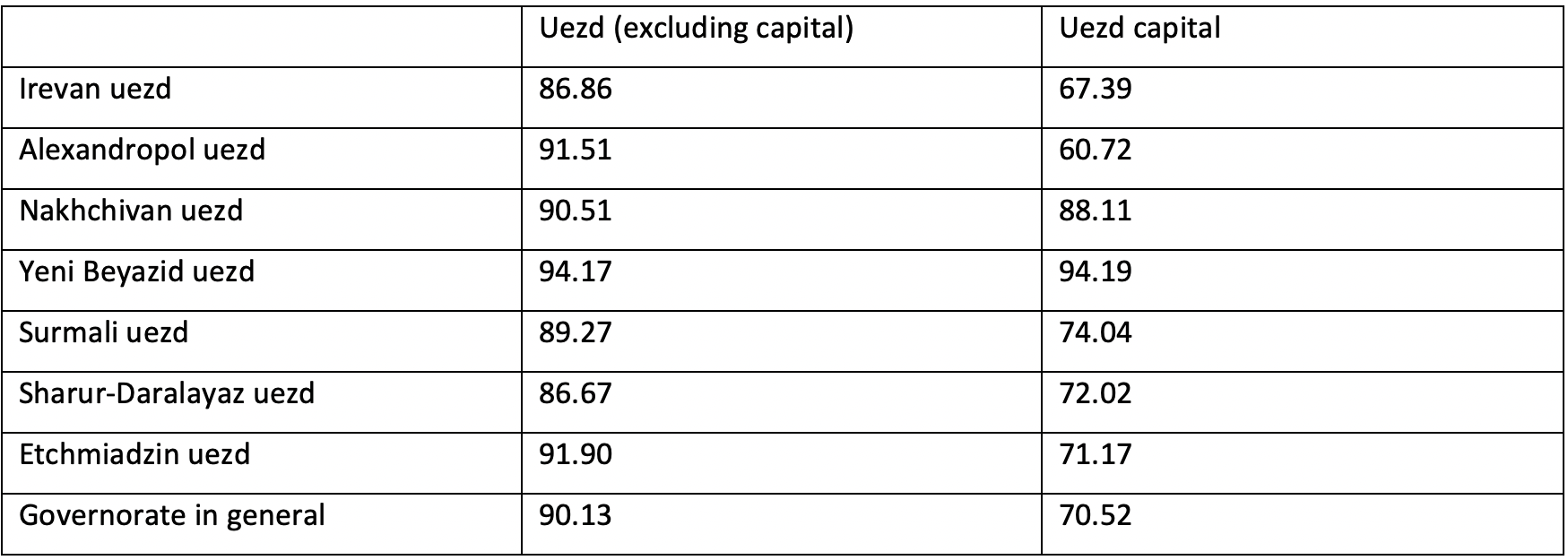As can be seen from the table, there were more men than women in all uezds and cities of the governorate. Particularly striking is the fact that there were fewer women in urban areas than in rural areas. There was a relative balance in Yeni Beyazid uezd, and the highest imbalance was in Alexandropol uezd. Note that the majority of the population in these 2 uezds were Armenian. The small number of women in Irevan Governorate may also be due to army units stationed in the cities. If we exclude soldiers and officers, the number of women for every 100 men in Irevan Governorate was about 86.