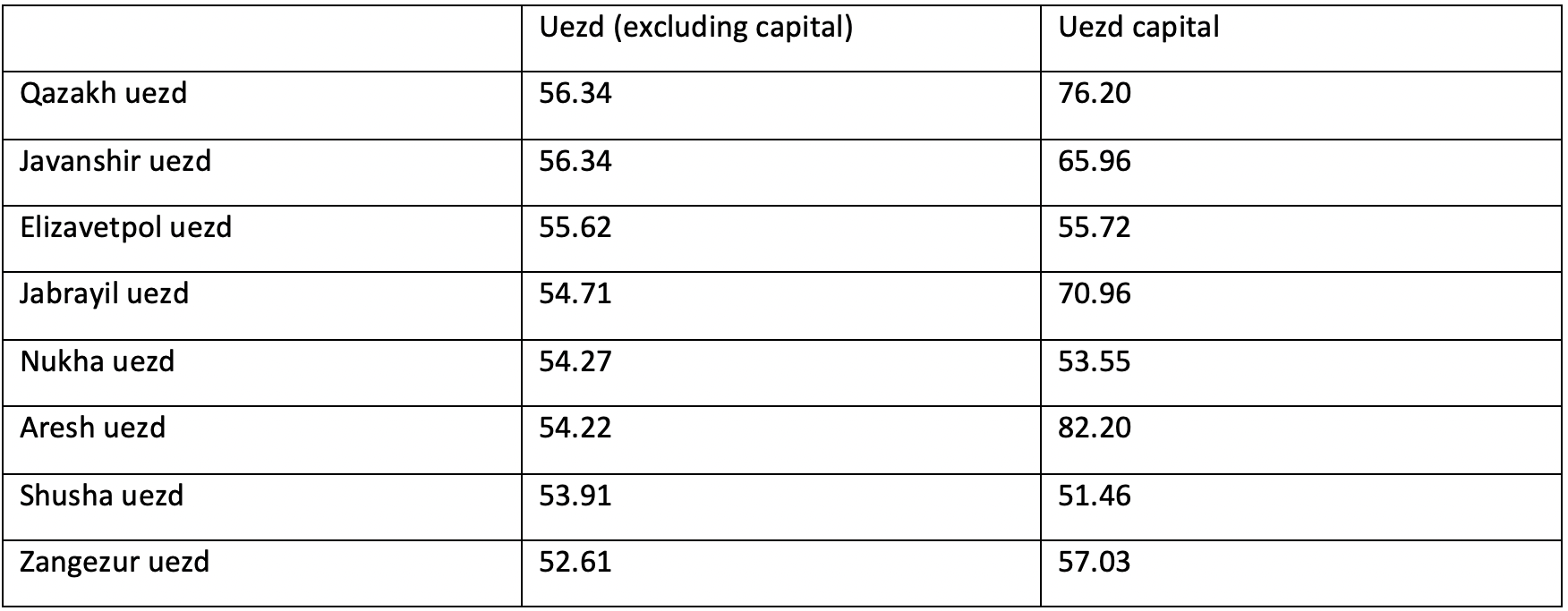 As the table shows, men made up 82 percent in Agdash, 76 percent in Qazakh, and 71 percent in Jabrayil. Agdash was the city with the highest male-to-female ratio (out of 528 people 434 were men, 94 were women) in tsarist Russia.[2] Of the children aged 0-9 in the uezd, 162,399 were boys and 135,221 were girls. According to the 1897 statistics, only Shusha uezd and the uezd capital, Shusha, had a relatively balanced female-to-male ratio.