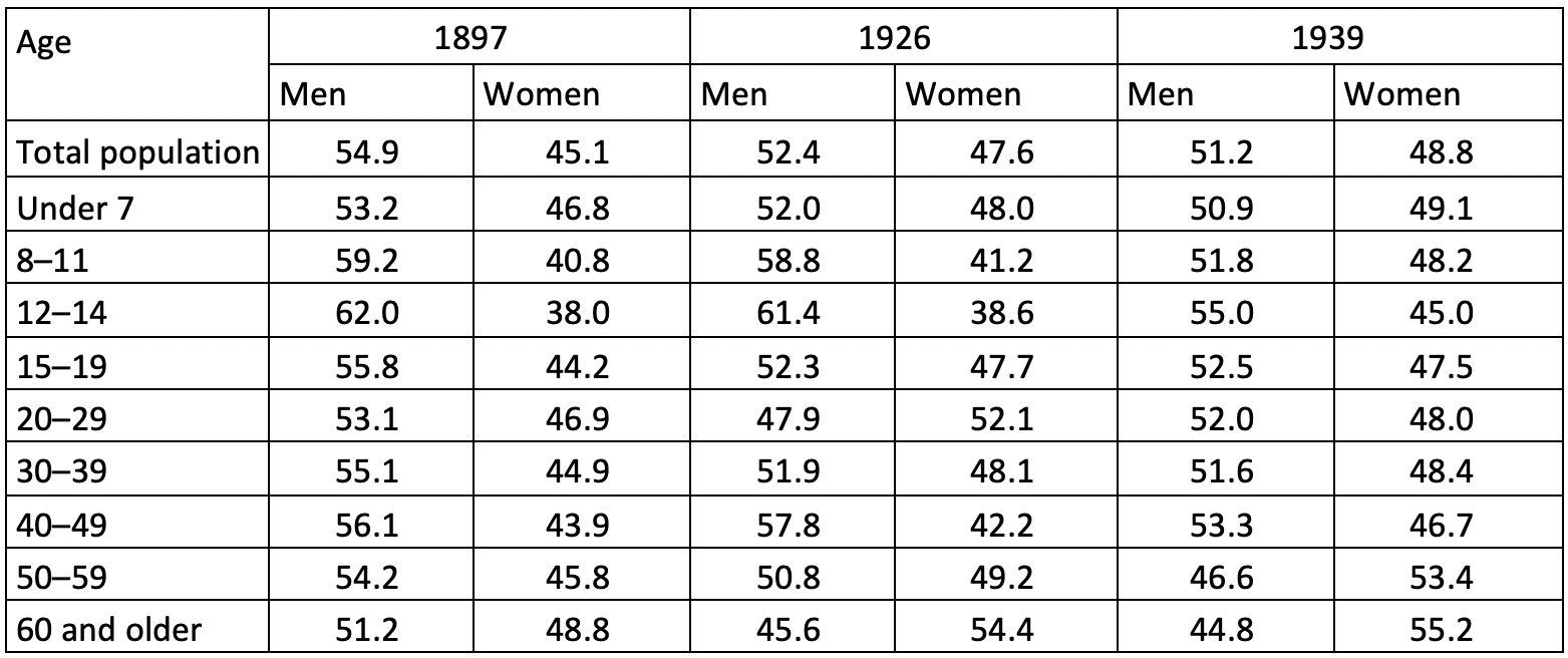 The lowest number of women in Baku Governorate was recorded in Baku uezd. Among the uezd capitals, the city of Goychay stood out (1,348 men and 853 women out of a population of 2,201). There was a balance in the female-to-male ratio in Quba uezd and, among the uezd capitals, in the town of Salyan. Similar indicators were recorded in Tiflis Governorate as well. In Borchaly uezd, home to Azerbaijanis of that governorate, 54.8 percent of the population were male, and in Zagatala uezd, 53.9 percent were male (Troynitskiy, 1905:1). In other governorates, where Georgians were a majority, the result was no different. Only in the town of Sighnaghi, the capital of Sighnaghi uezd, the number of women slightly exceeded that of men. The male population in other governorates of the region, including uezd capitals, was higher than the female population. Interestingly, in Dagestan Oblast, which bordered Baku Governorate, the female population exceeded the male population. While the sex ratio among the Avars, Dargins, Lezgins, and Laks inhabiting this region was skewed toward women, there were more men among the Azerbaijanis, Tatars, Armenians, and Georgians living there. This trend among the peoples of the South Caucasus was also observed in other areas. The higher number of men among Azerbaijanis can be linked to both higher rate of male births and Azerbaijani men being exempted from compulsory military service by the officials of tsarist Russia. But the fact that there were more men than women among Armenians and Georgians, who did serve in the army, suggests that this is a demographic indicator characteristic of the region. According to the 1897 statistics, 54.9 percent of the population of Azerbaijan were men and 45.1 percent were women. This is considered the first known and highest figure in the history of Azerbaijan.