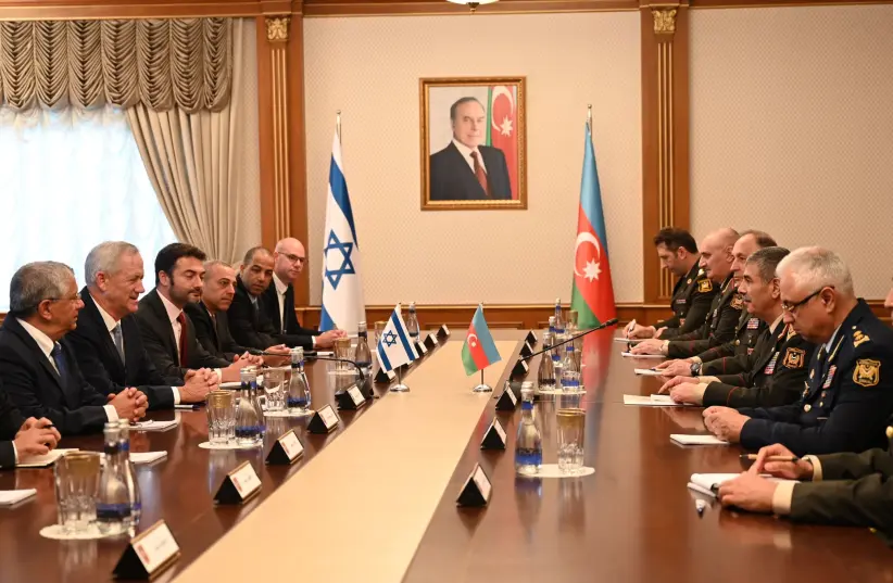 Defense Minister Benny Gantz and Azerbaijani Defense Minister Zakir Hasanov, during Gantz's visit to Azerbeijan, October 3, 2022. (photo credit: NICOLE LASKVI/DEFENSE MINISTRY)
